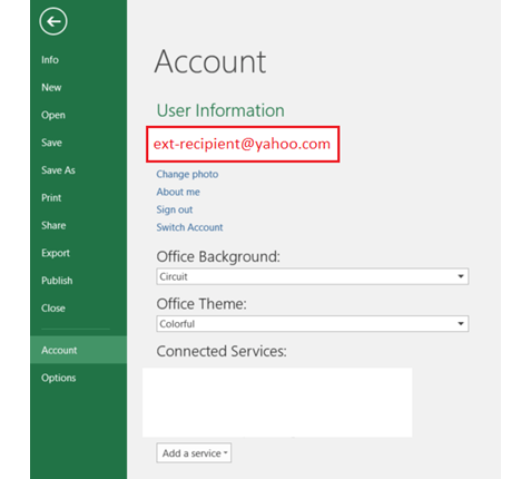 За да отворите защитен Майкрософт офис файл (Word, Excel, PowerPoint и др.), трябва да сте логнати с потребителски профил, който е регистриран със същия имейл като този, до когото е изпратено защитеното съобщение (виж фиг. 1)